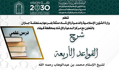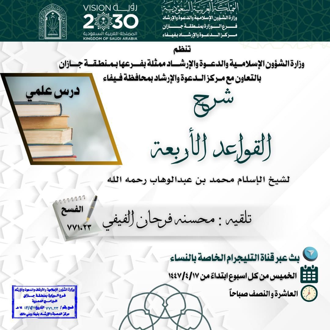 ينظم فرع وزارة الشؤون الإسلامية والدعوة والإرشاد في منطقة جازان ممثلا بمركز دعوة محافظة فيفا عدد من الدروس العلمية النسائية والتي تنطلق في الخامس عشر من شهر ربيع الثاني 1447 هجرية وتستمر إلى الحادي والعشرون حضروياً بحلقة أم سلمة بجامع الفرحة وعن طريق التليجرام .