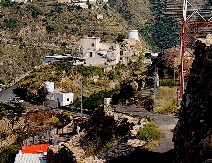 تغلغلنا بين البيوت في هذه الجهة، وكان هناك طريق يتفرع من هذا الطريق إلى الاسفل، يصل إلى بقع وبيوت ومدرجات كثيرة هناك، ومنها قرية (آل حسين) البيتين، ونرى من هذا المكان الجبال المجاورة المحادة لها من الشمال مثل آل النخيف، وهما يلتقيان في وادي المحمور تحتنا، وجزء من وادي حرّن، حيث توجد في اعلى هذا الوادي مزرعة العين للبن المشهورة، ولكن تحجبها عنا من هنا بعض التضاريس.