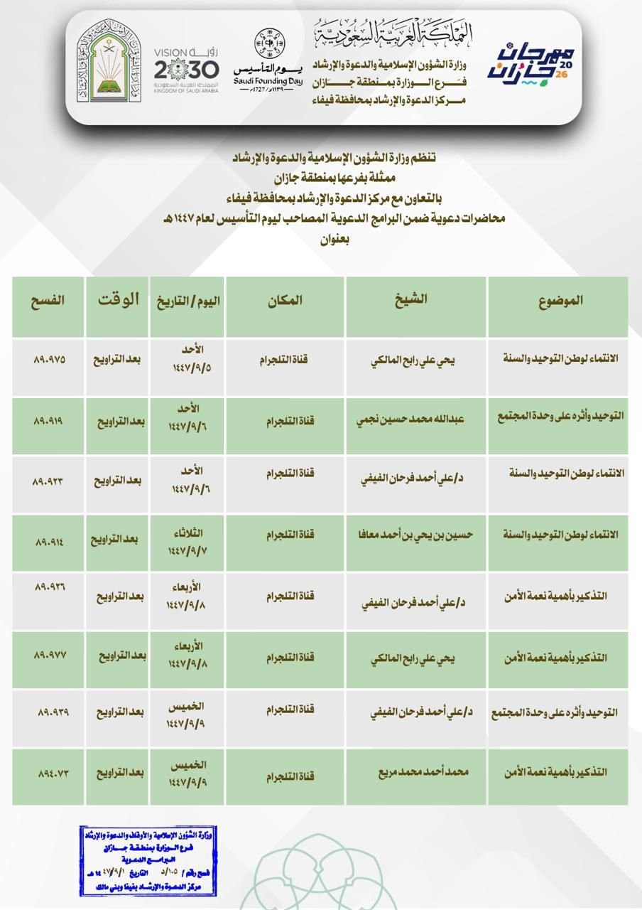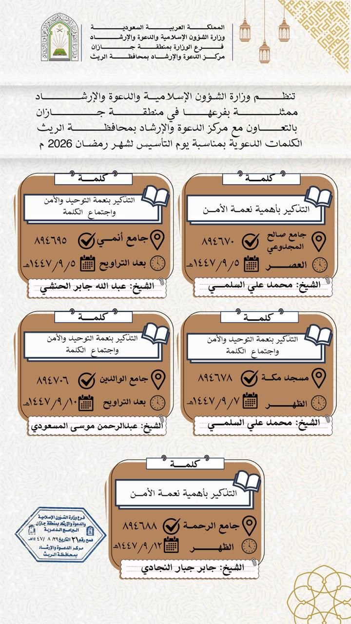 تنظم وزارة الشؤون الإسلامية والدعوة والإرشاد ممثلة بفرعها في منطقة جازان مركز دعوة فيفا ومركز دعوة الريث عدد من المناشط الدعوية خلال الفترة من 1 إلى 19 رمضان للعام 1447 للهجرة .