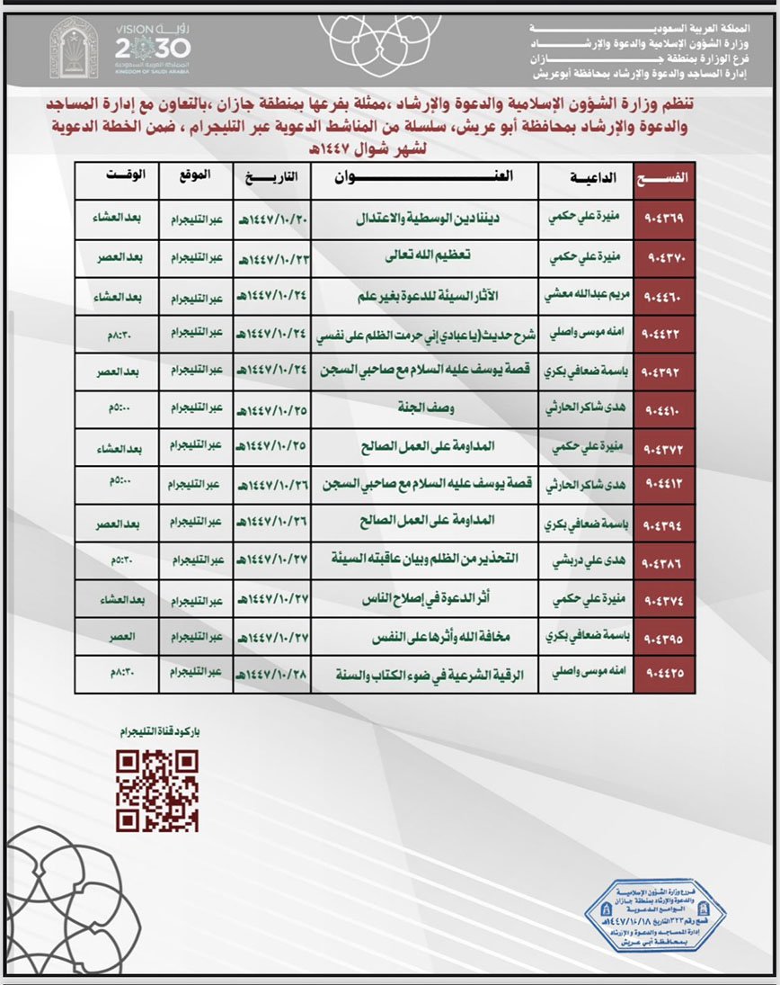 تنظّم وزارة الشؤون الإسلامية والدعوة والإرشاد، ممثّلةً بفرعها في منطقة جازان – إدارة المساجد بمحافظة أبو عريش – سلسلة من المناشط الدعوية النسائية عبر الاتصال المباشر، وذلك ابتداءً من مساء العاشر من شهر شوال لعام 1447هـ، وتستمر حتى نهاية الشهر.