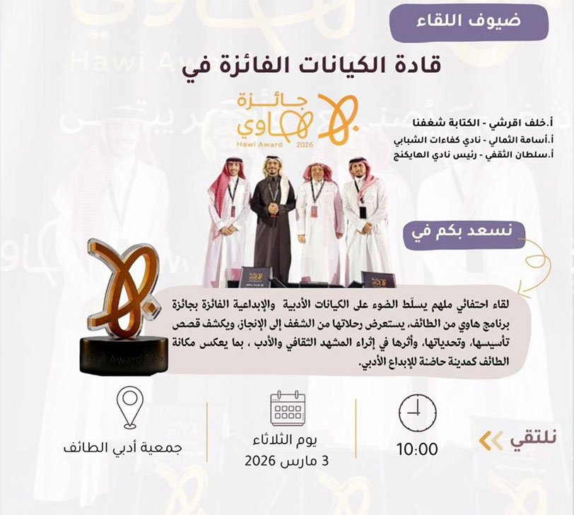 جاء اللقاء احتفـاءً بقادة الكيانات الأدبية والإبداعية الفائزة بـ جائزة هاوي لعام 2026 ، فكان التكريم احتفاءً بالرحلة قبل النتيجة ، وبالإصـرار قبل المنصة. وتحـولت منصة الحوار إلى مساحة اعتراف جميلة بالتعب الخفيّ خلف كل منجـز ، وبالحـلم الذي كبر حتى صار كيانًا.