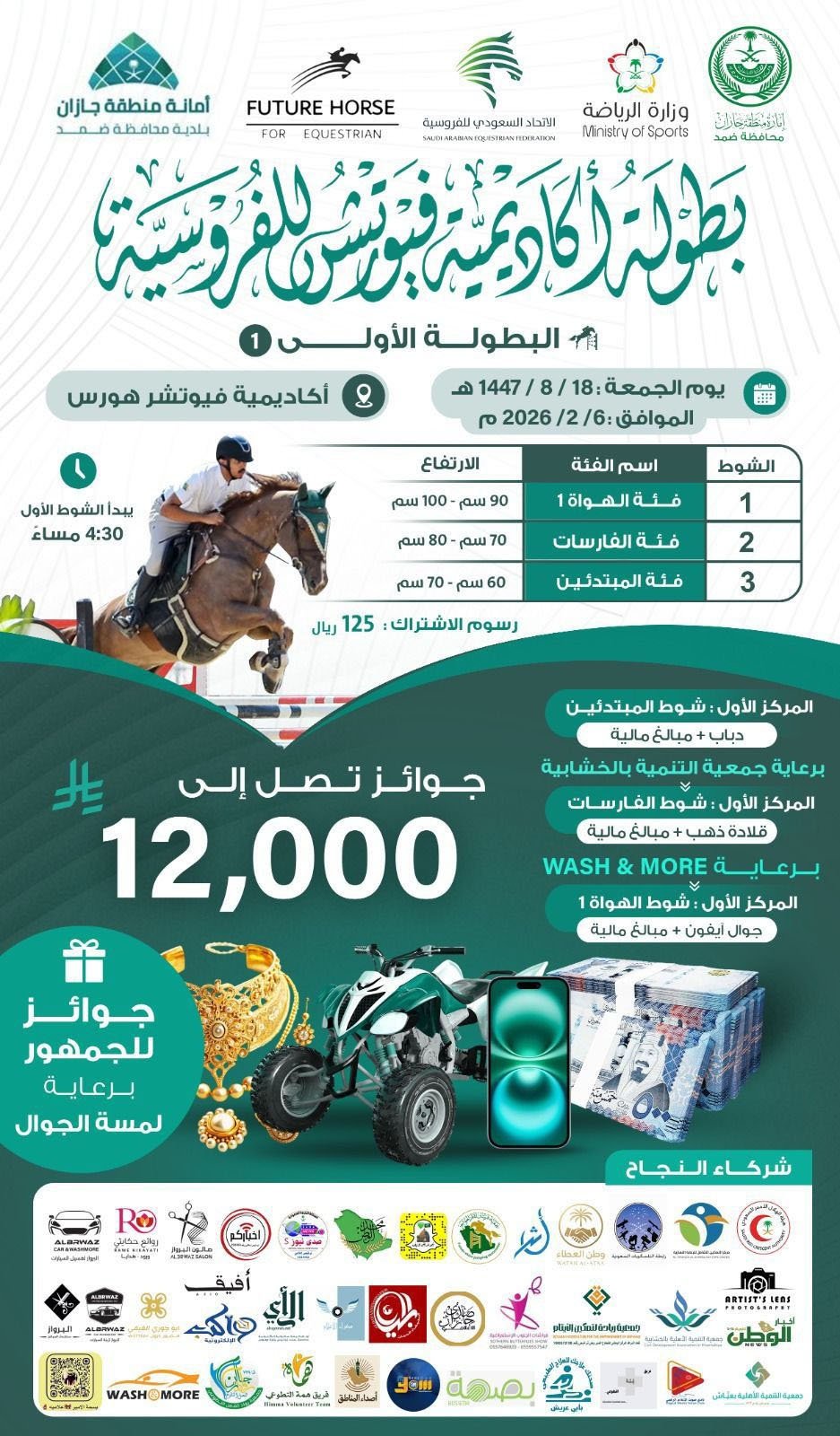 في مشهد أصيل وحضور مميز انطلقت يوم الجمعة 6 / 2 / 2026 بطولة أكاديمية فيوتشر هورس للفروسية بمنطقة جازان، حيث بدأت الفعالية الرياضية بعد صلاة العصر، وسط أجواء حماسية ومشاركة مميزة من فرسان قدموا من عدة مناطق.