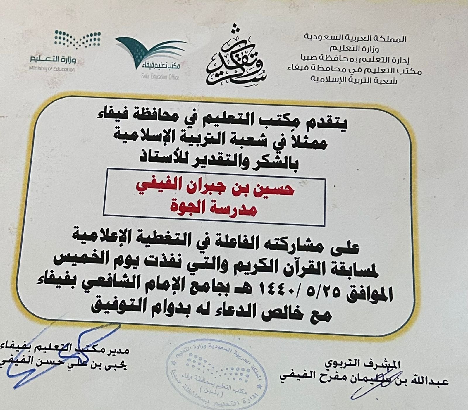 نال الأستاذ حسين الفيفي العديد من شهادات الشكر والتقدير، لكنها لا توازي شهادة القلوب التي أحبته، ولا كلمات الامتنان التي تُقال في غيابه قبل حضوره.