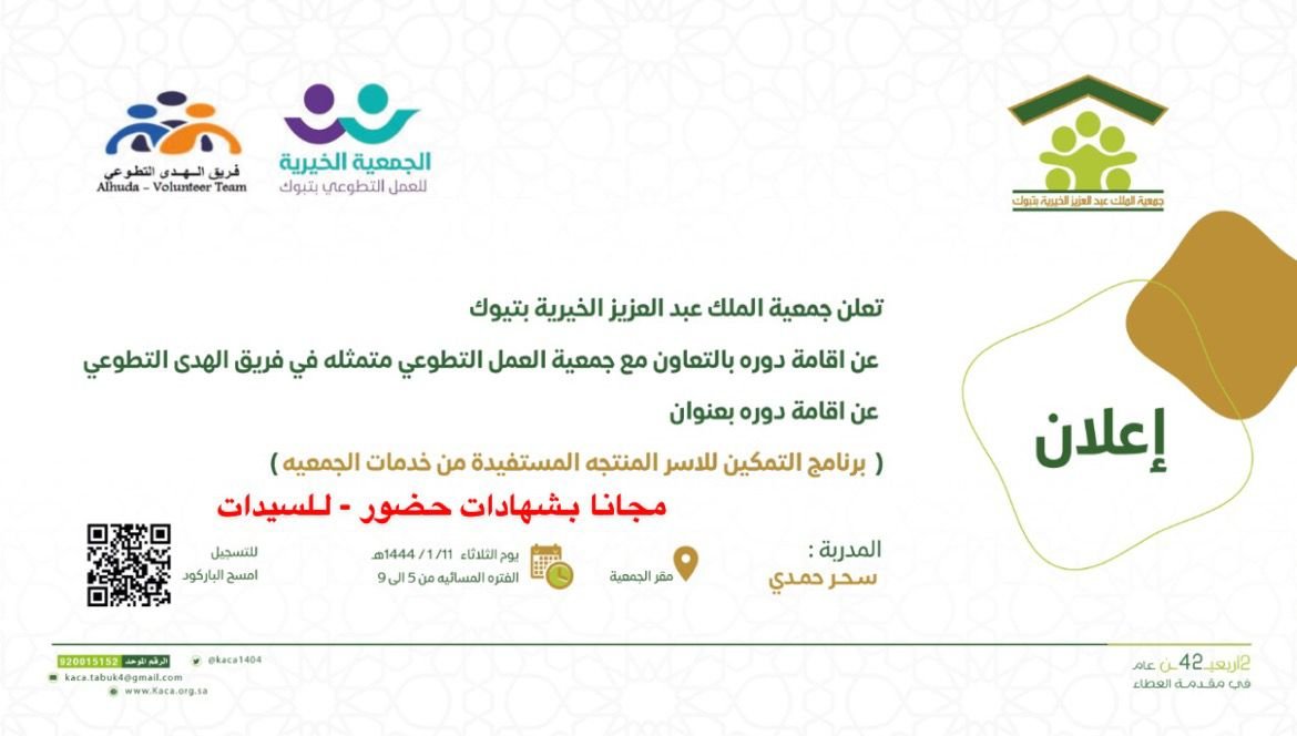 تعلن جمعية الملك عبدالعزيز الخيرية بالتعاون مع جمعية العمل التطوعي متمثلةً