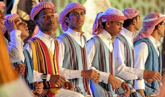 وبعضهم يضع  على بطنه حزام وفي وسطه سكينة والجنبية وكانت في ذلك الوقت شعار للرجولة.