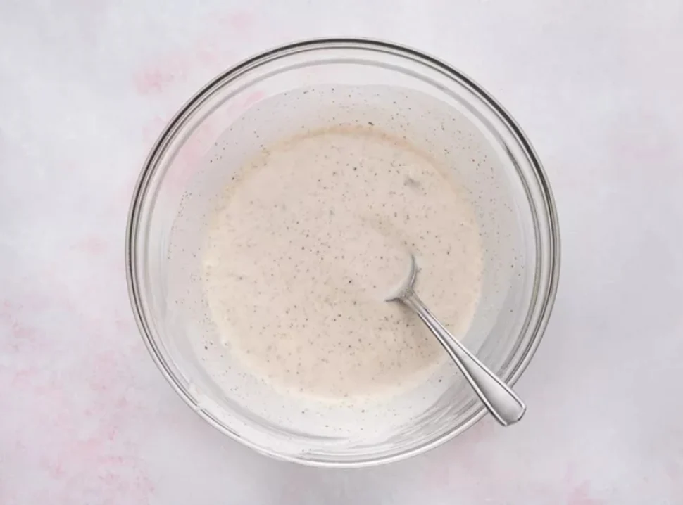 في وعاء آخر، امزجي الزبادي اليوناني، والطحينة، وعصير الليمون، والثوم المفروم، والفلفل الأبيض، والملح حتى تصبح الصلصة ناعمة ومتجانسة.
