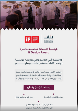 حصدت هيئة التراث جائزة “آي إف” العالمية للتصميم If Design Award التي تعد من أبرز الجوائز المرموقة في مجال التصاميم والمساحات الإبداعية، وتمنحها مؤسسة IF design & Jury Awards في برلين.