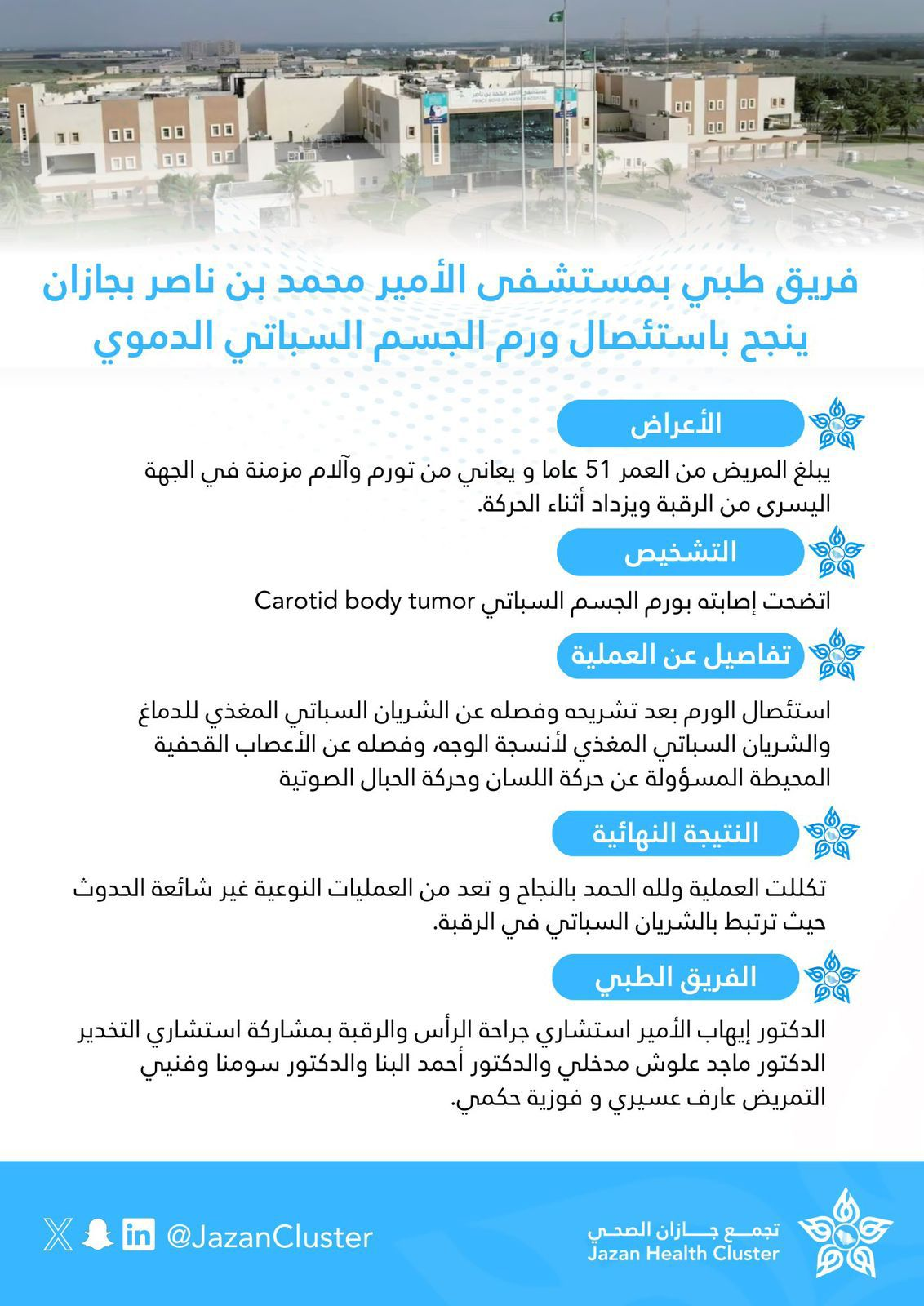 وأضاف بأن الفريق الطبي قام بإجراء الفحوصات الطبية اللازمة واتضحت إصابته بورم الجسم السباتي Carotid body tumor، حيث قرر إجراء عملية جراحية تم من خلالها استئصال الورم بعد تشريحه وفصله عن الشريان السباتي المغذي للدماغ والشريان السباتي المغذي لأنسجة الوجه، وفصله عن الأعصاب القحفية المحيطة المسؤولة عن حركة اللسان وحركة الحبال الصوتية وتكللت ولله الحمد بالنجاح.