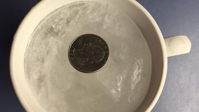 تقضي الحيلة هذه بوضع كوب من الماء في الثلاجة أو الفريزر حتى يجمد الماء فيه ثم وضع عملة معدنية على سطح الماء المثلج. والسبب؟