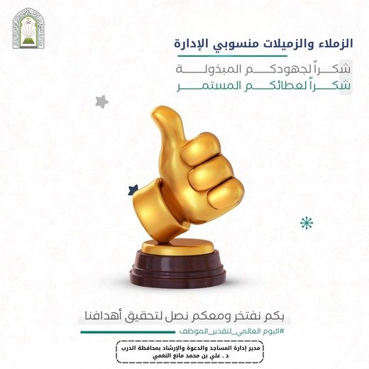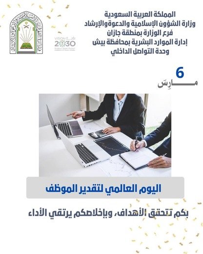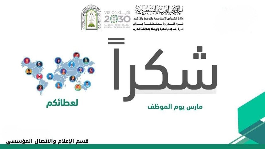 ثمّن فضيلة المدير العام لفرع وزارة الشؤون الإسلامية والدعوة والإرشاد بمنطقة جازان، الشيخ الدكتور خالد بن أحمد النجمي، الجهود المخلصة والمتميزة التي يبذلها منسوبو ومنسوبات الفرع ومراكز الدعوة وإدارات المساجد، إلى جانب المراقبين والمراقبات في الميدان ، تزامنًا باليوم العالمي لتقدير الموظف.