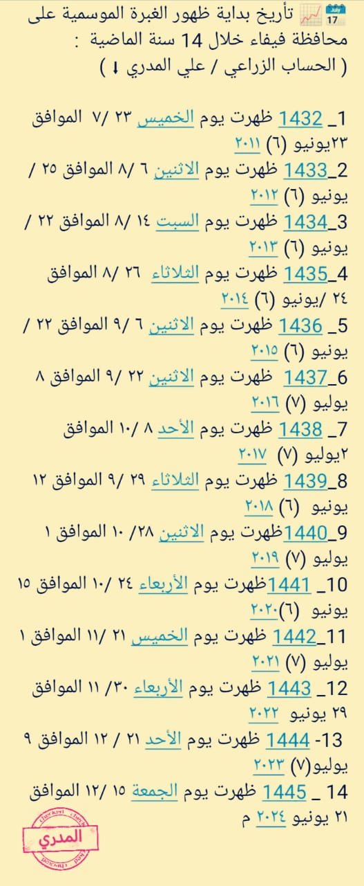 وبالنظر في توقيت ظهور الغبرة الموسمية خلال ١٤ سنة الماضية نجد أنها تتراوح في المتوسط
