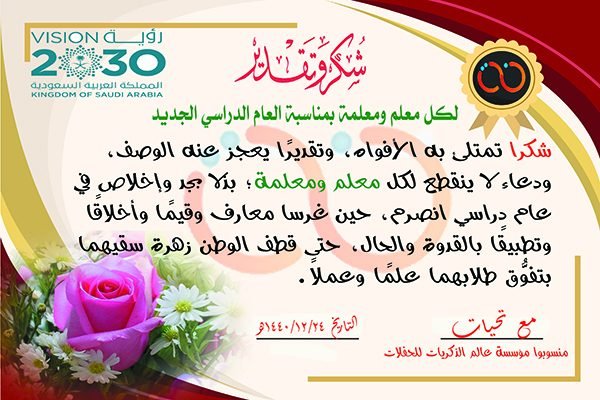 من أعماق القلب، حيث نرسل المشاعر لكم رسالةً من نور، لتخترق جدار التميز والإبداع، وتصل إلى قلب كل معلم ومعلمة، يا رموز التميز ويا اصاحب العطاء، يا اسياد الفكر العميق، شكراً لأنكم زرعتم القيم ومحوتم الجهل وأنرتم القلوب بنور العلم.